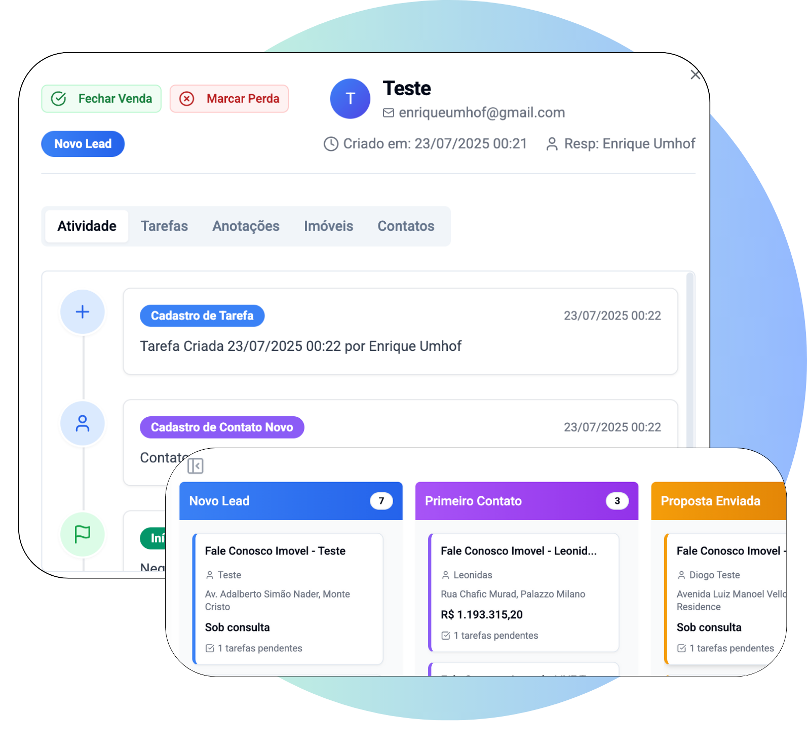 Tudo o que você faz na plataforma imóveis, leads, interações já cai no seu CRM de forma automática.