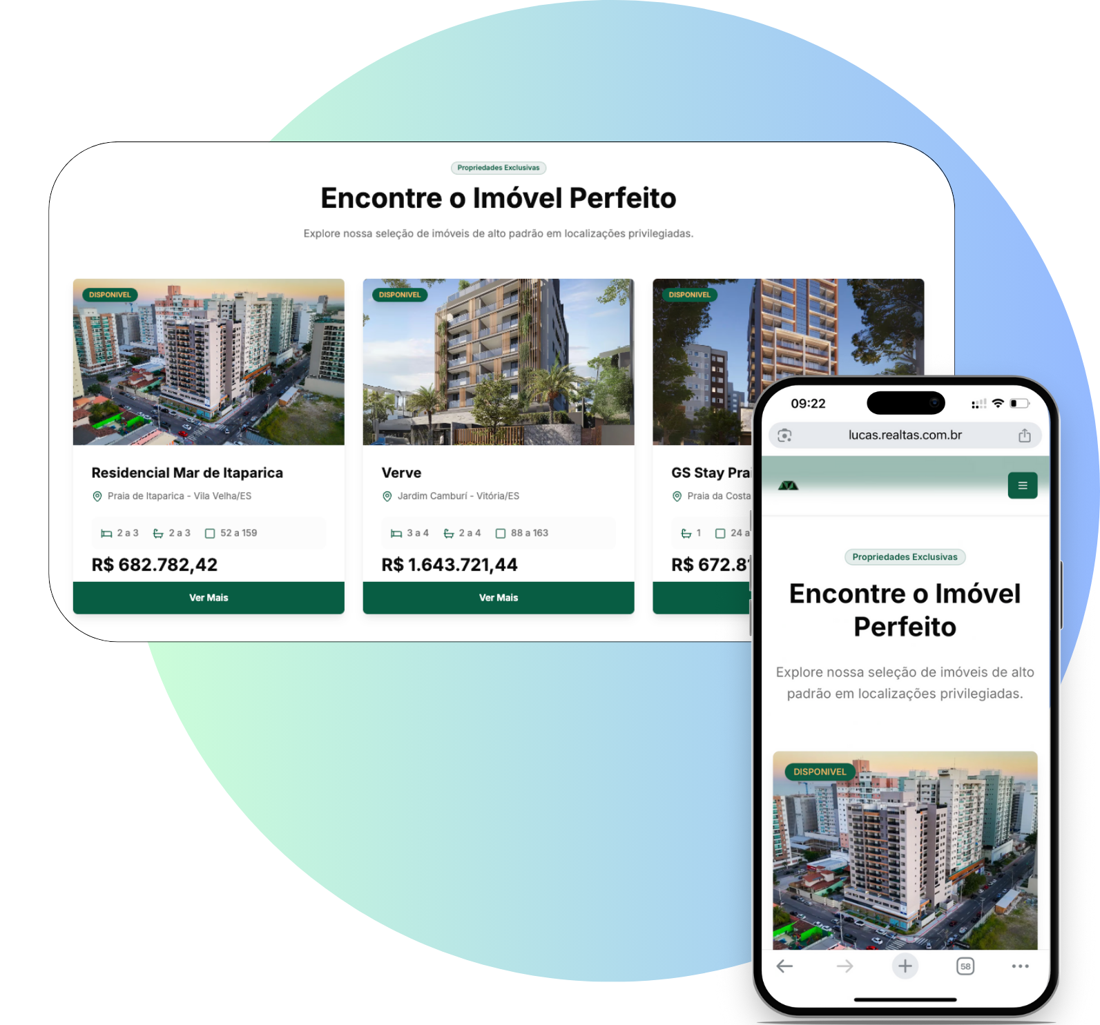 Com a Realtas, você ativa seu site profissional em poucos segundos e todos os imóveis que você capta ou faz parcerias no app (construtoras ou outros corretores) vão direto pro seu site, em tempo real.