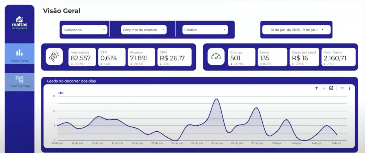 Todos os dados das campanhas em um só lugar — atualizados automaticamente.